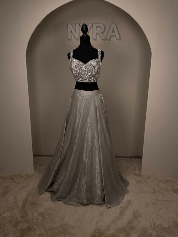 A refined silver-grey ensemble featuring a delicately hand-embellished blouse with intricate beadwork and a fluid, softly draped skirt. Radiating understated elegance and luminous charm, this design is perfect for modern festivities and evening celebrations.