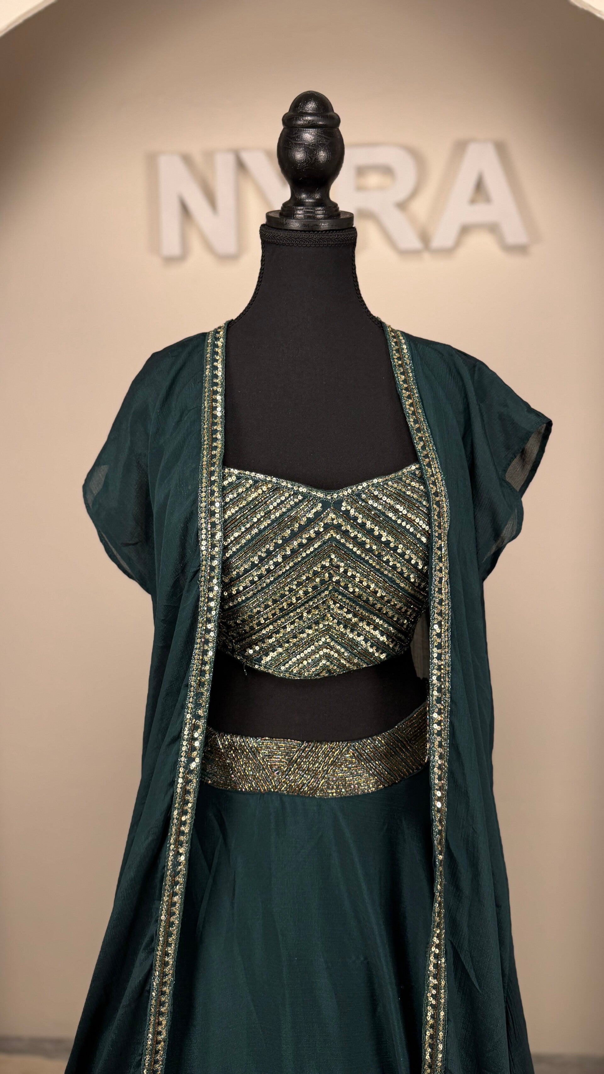 A stylish short lehenga in deep emerald tones, featuring elegant detailing and a modern silhouette. Perfect for festive nights, it combines traditional charm with a bold, contemporary look.