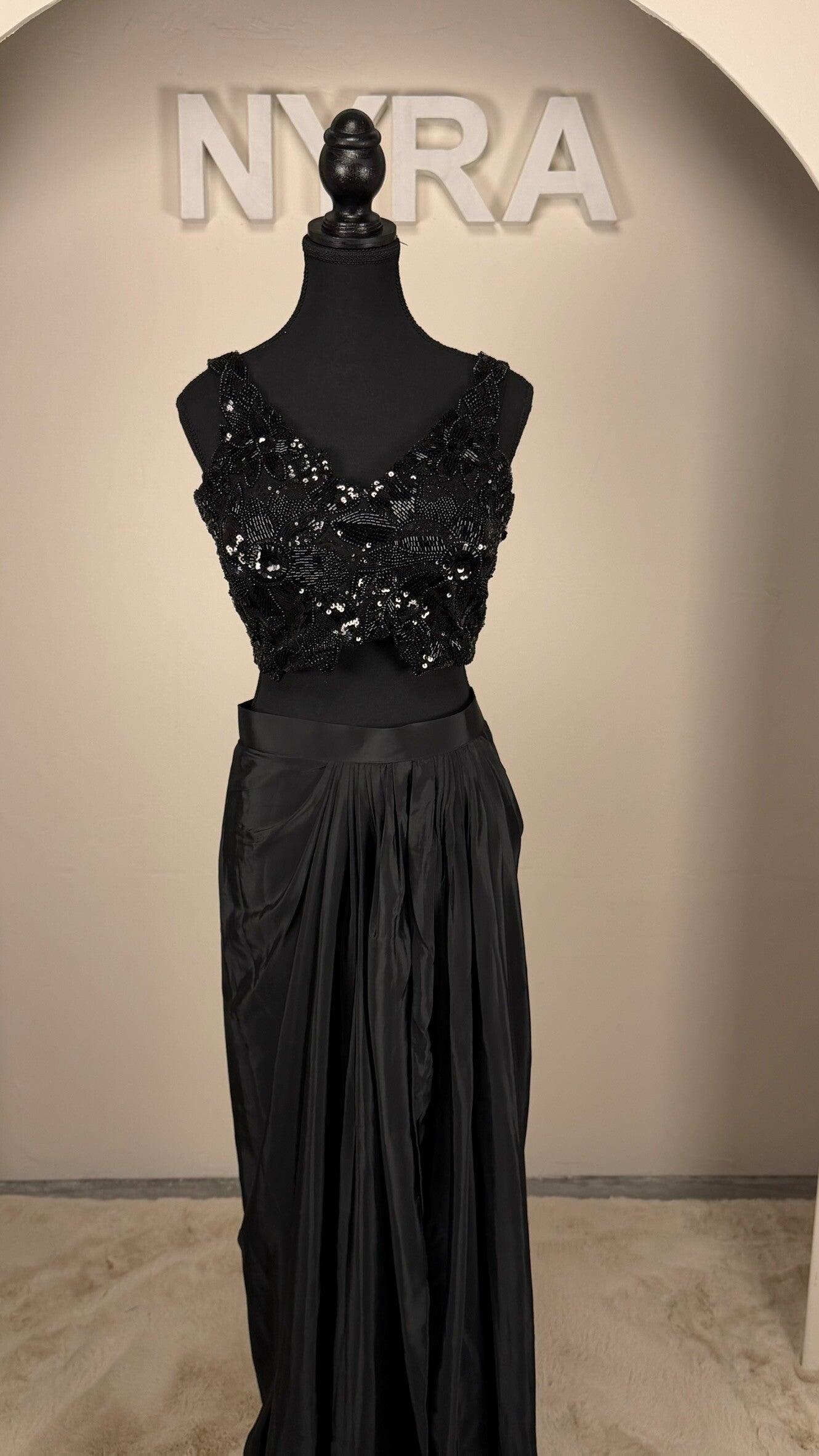 A graceful short lehenga set in timeless black, designed with a refined and modern aesthetic. The ensemble features a simple, elegant skirt that flows beautifully and creates a clean, sophisticated silhouette. It is paired with a statement blouse that is richly embellished with delicate sequins and intricate detailing, making it the true highlight of the outfit. The blouse is crafted with a beautiful, flattering cut that enhances the overall look with a touch of glamour and femininity.